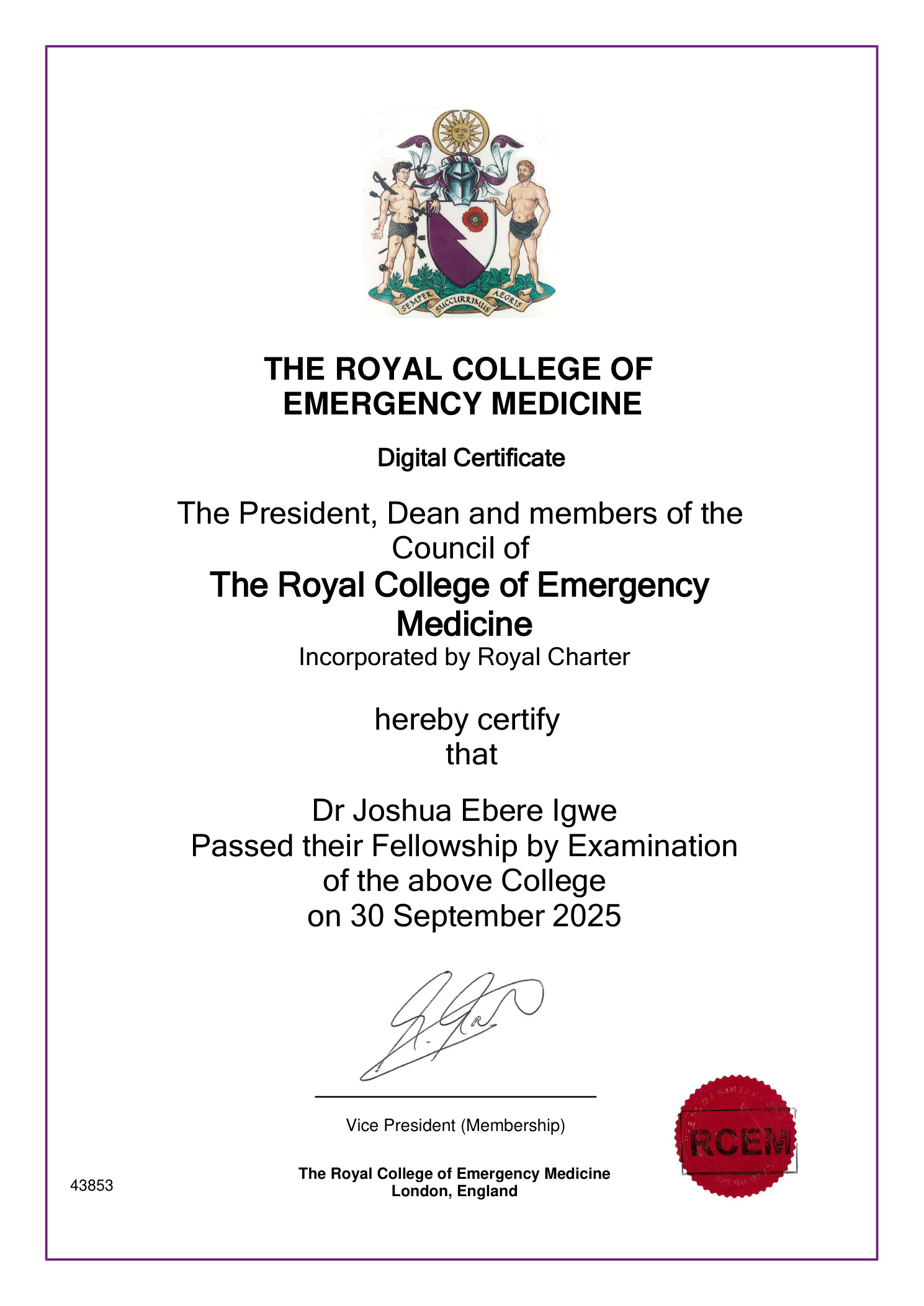 The FRCEM is the highest postgraduate examination in emergency medicine in the United Kingdom, awarded by The Royal College of Emergency Medicine, London, incorporated by Royal Charter. It requires successful completion of the FRCEM Primary and Final examinations, encompassing applied basic sciences, critical appraisal, acute care, and management of the undifferentiated emergency patient.