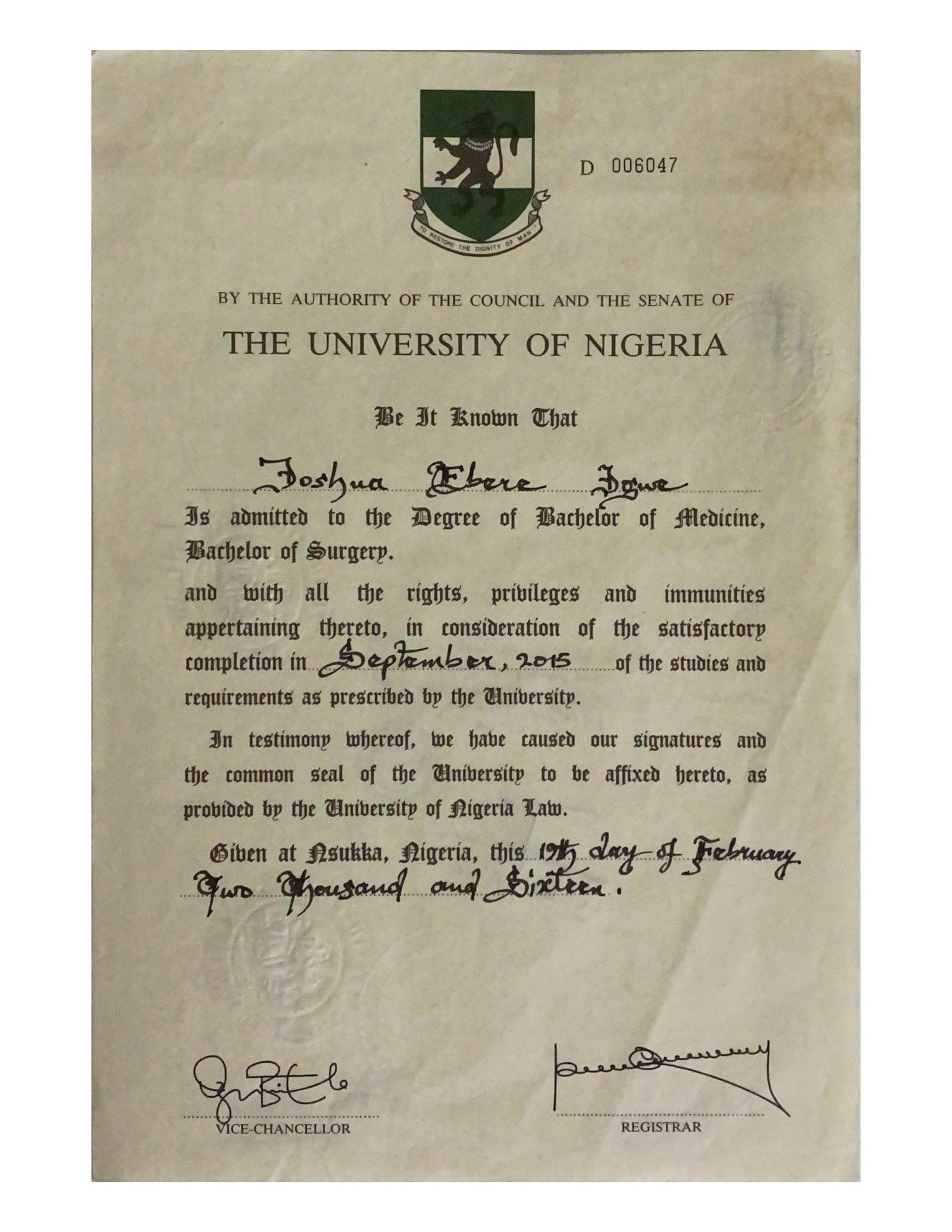 The MBBS was awarded by the University of Nigeria, Nsukka, following six years of undergraduate medical training encompassing preclinical sciences, clinical rotations across internal medicine, surgery, paediatrics, obstetrics and gynaecology, psychiatry, and community health. The degree confers full rights and privileges to practise medicine as prescribed by the University of Nigeria Law. Awarded by the authority of the Council and Senate of the University of Nigeria.