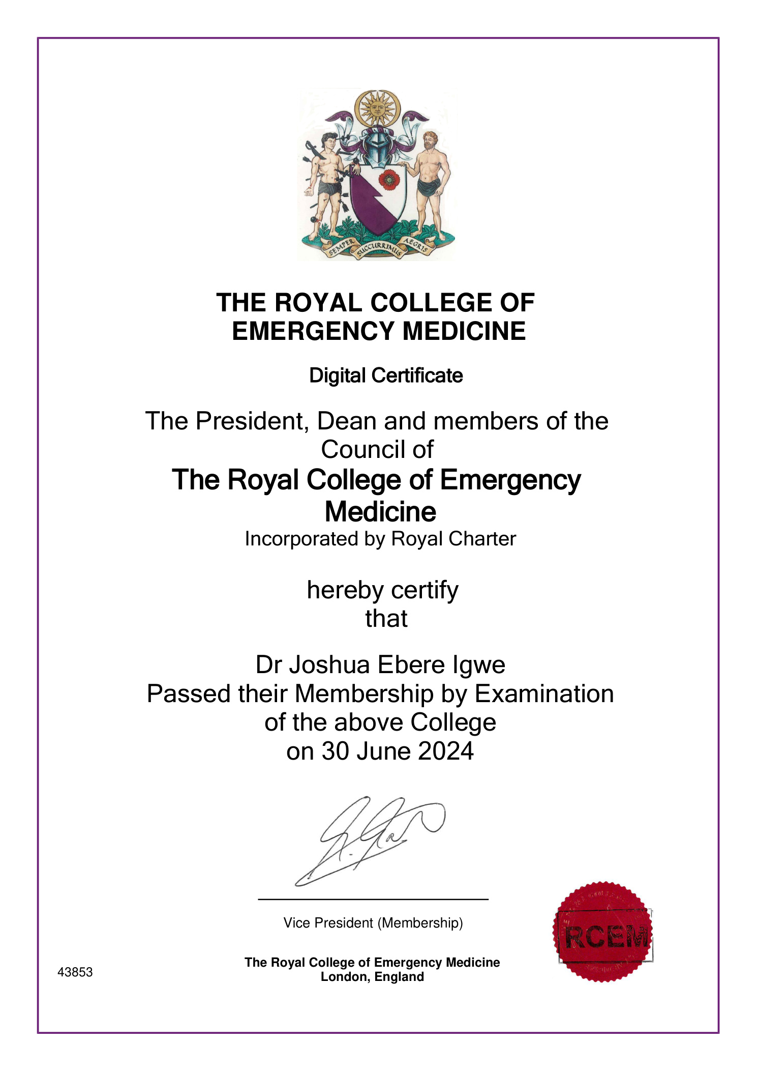 The MRCEM is awarded by The Royal College of Emergency Medicine following successful completion of three written papers: MRCEM Part A (applied basic sciences), MRCEM Part B (intermediate emergency medicine), and MRCEM OSCE (clinical skills and communication). It is the core membership examination for emergency medicine trainees across the UK and internationally.